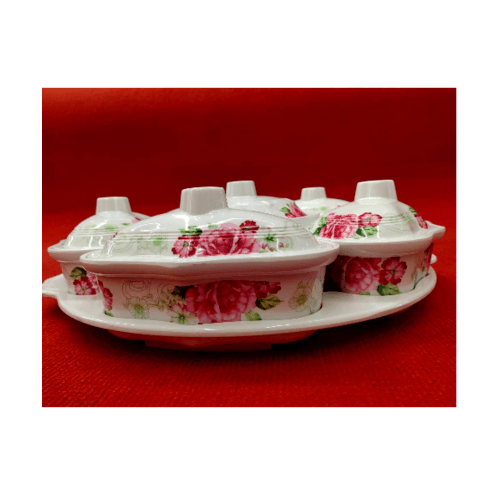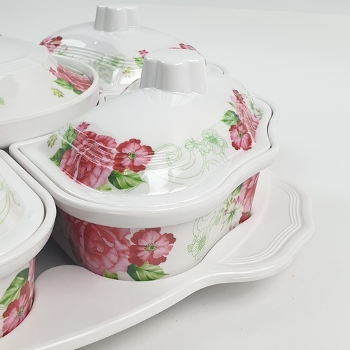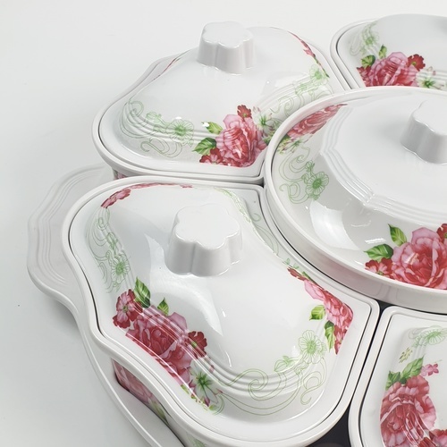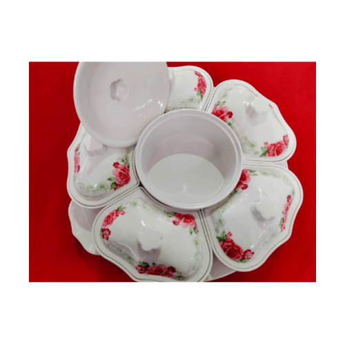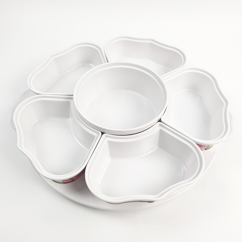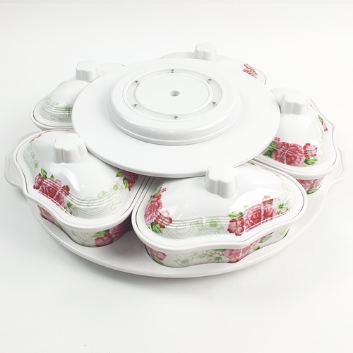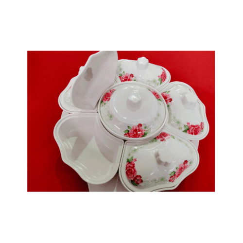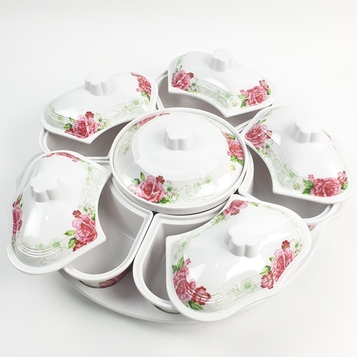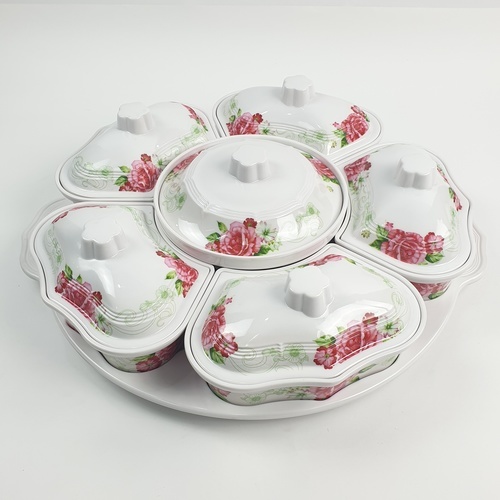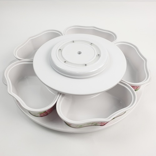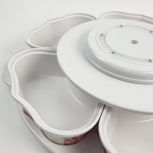 Melamine Rose Dish Set ชุดจานเมลามีนโรส ลายดอกไม้สีขาวแดง สามารถใส่อาหารได้หลายช่อง หมุนได้360องศา