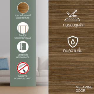 ที่มีโครงสร้างภายในเป็นไม้เนื้อแข็ง อบแห้งรอบบาน ปิดผิวเสริมความแกร่งด้วยเมลามีน ทำให้ผิวหน้าประตู ทนต่อรอยขูดขีด ทนต่อความชื่นได้ดี และยังมีระบบพิมพ์ลายไม้ธรรมชาติ ทำให้ประตูมีความสวยงาม ประตูไม้เมลามีน ทำความสะอาดง่าย โดยใช้ผ้าสะอาดชุบน้ำ บิดหมาดๆเช็ดสิ่งสกปรกออก ประตูเมลามีน มีหลายแบบ หลายขนาดให้เลือก ผลิตจากวัสดุคุณภาพดี และผ่านกระบวนการผลิตที่ได้มาตรฐานทุกขั้นตอน ติดตั้งง่าย